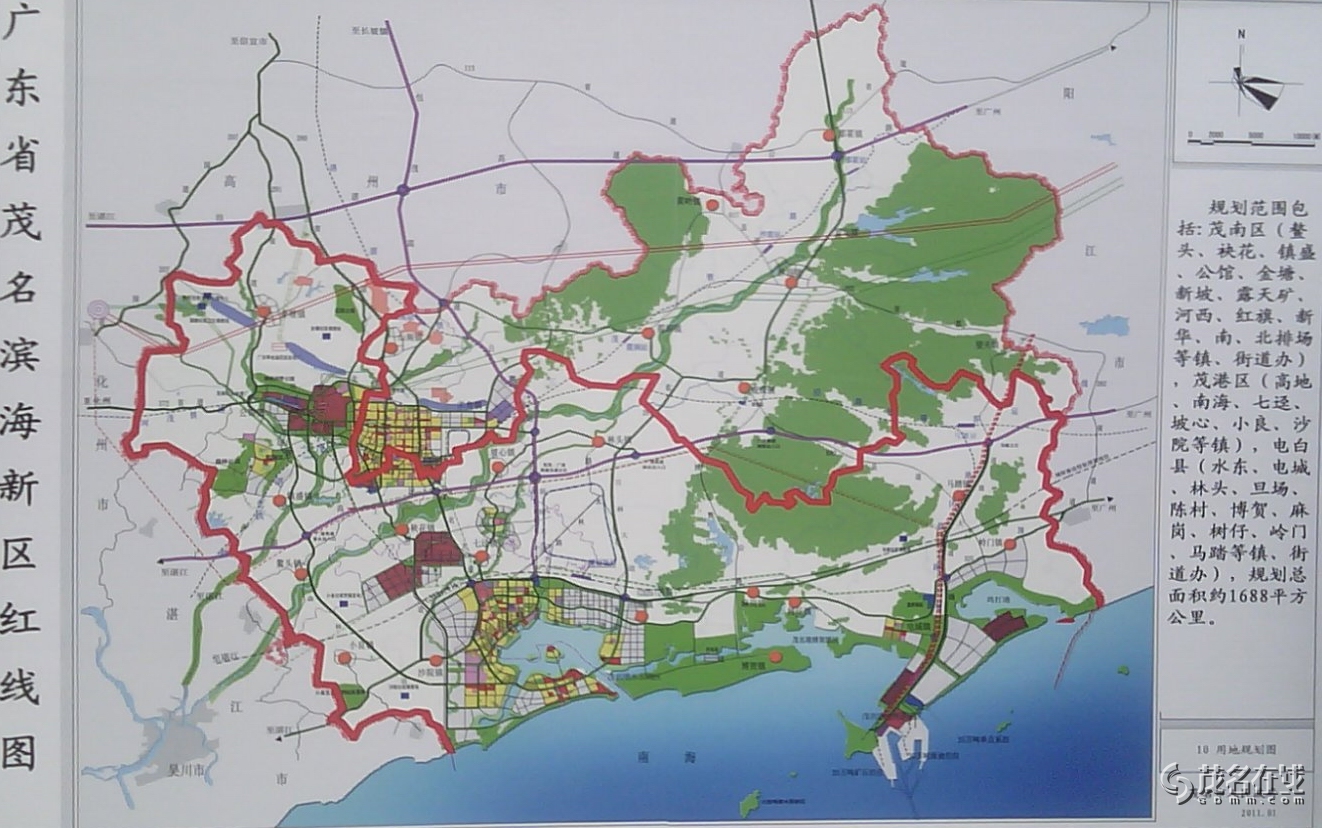 建设广东省茂名滨海新区,是中共中央政治局委员、广东省委书记汪x今年3月31日在茂名视察时提出的重大战略构想。随后,省政府常务会议同意广东省茂名滨海新区筹建工作全面启动。根据专家研究论证方案,广东省茂名滨海新区城市总体规划用地总面积1688平方公里,包括茂南区、茂港区、电白县等范围。