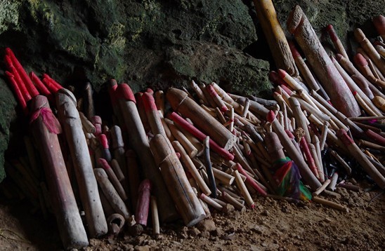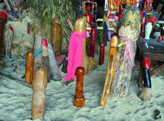 这是位于莱利半岛上的一处优美幽静的海滩起点处的山体上名为“phra nang”的天然小岩洞,当第一眼看到这个洞时,让人不得感叹大自然的鬼斧神功,太形象了!难怪被当地人称为“圣女洞”。洞里满地都是横七竖八、大小不一、颜色各异的阳具,这些擎天一柱,是莱利岛上居民放在圣女洞用于乞求生育或家丁兴旺的道具。雕工如此精细的假阳具让人看了这会脸红,也佩服泰国当地民众大胆的民风。