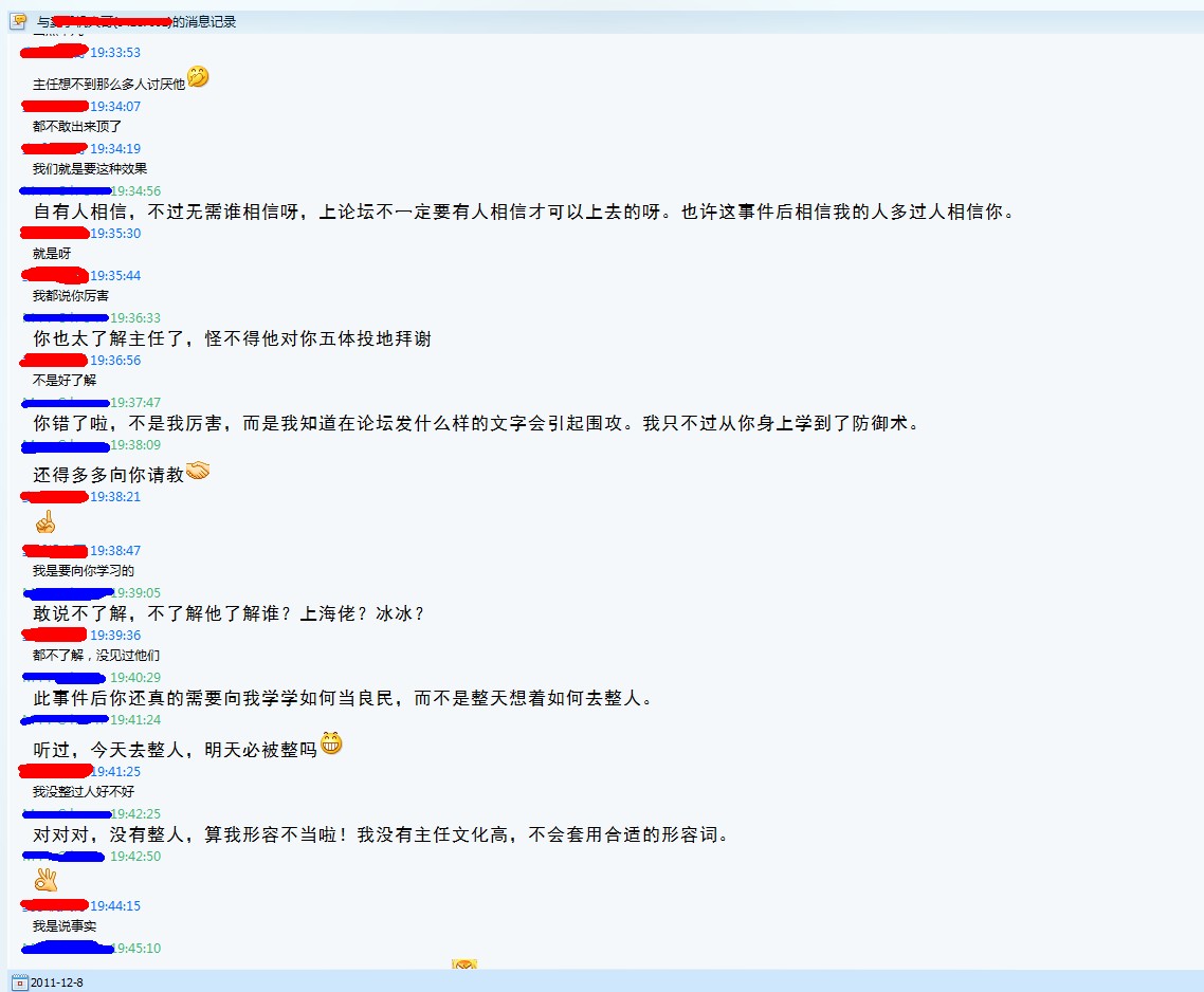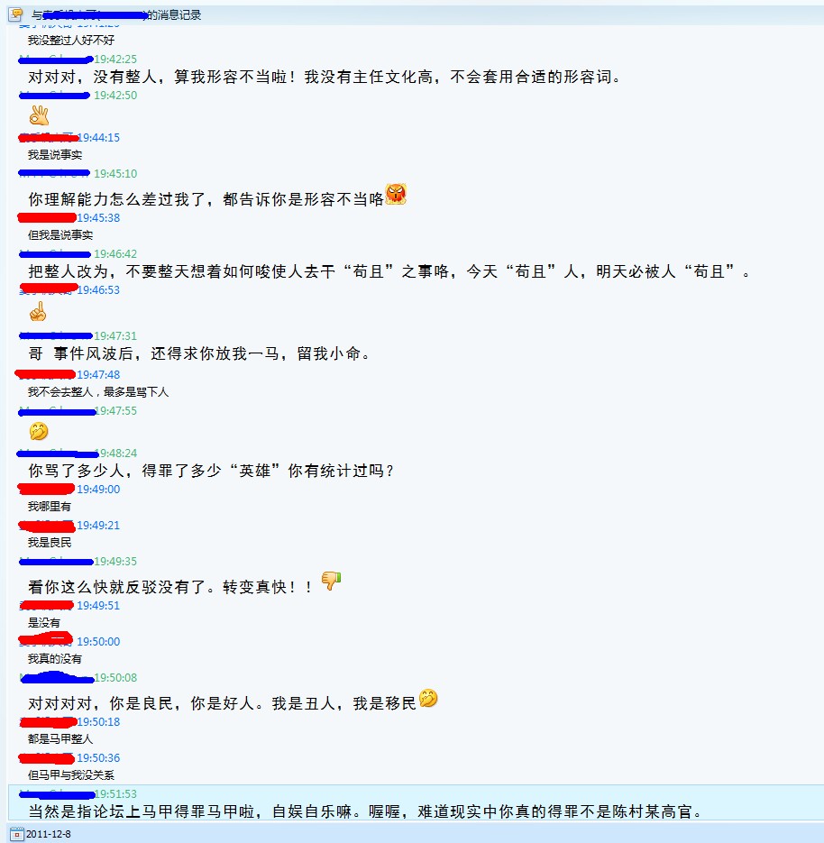 一统祖国 研究生 注册 2008-10-29 消息 1,139 反馈评分 0 点数 0 2011-12-08 #57 QUOTE(广州卖手机大哥 @ 2011年12月08日 Thursday, 05:50 AM) 主任,不要自作聪明,楼主发的聊天记录,就算对话的是县委书记,也不一定是,因为,我可以把我和胡锦涛的聊天记录发出来,难道你也相信是真的吗? [snapback]3287973[/snapback] 我相信。