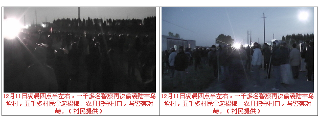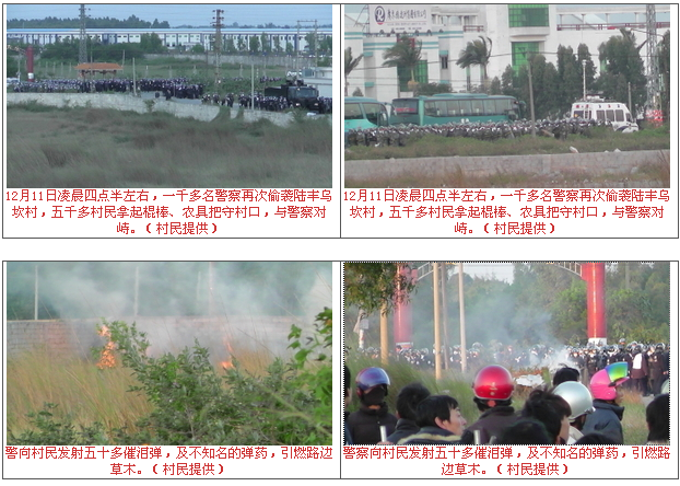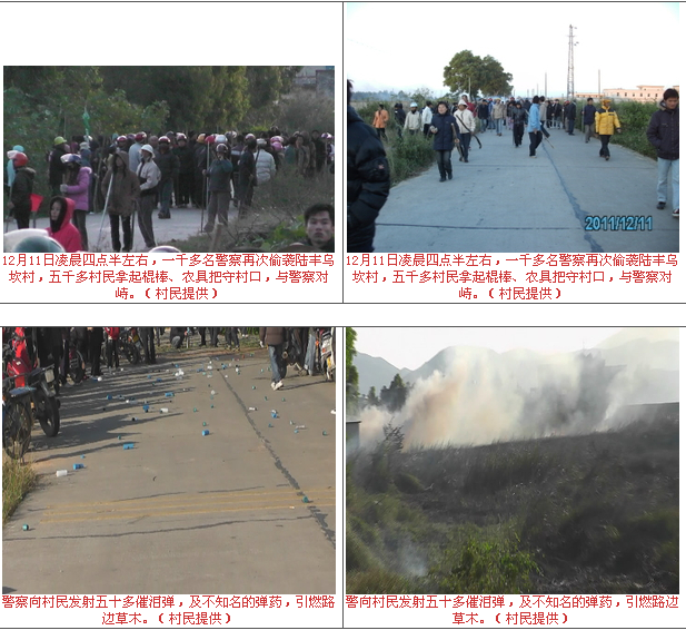广东陆丰乌坎村于今天(12月11日)凌晨四点半左右,一千多名全副武装的警察准备再次进村抓捕。村民闻讯敲响铜锣,五千多村民拿起棍棒、农具把守村口,与警察对峙。期间警察发射五十多枚催泪弹和其它弹药,上午7点左右村民被迫撤离村口,之后警察全部撒离。据说同一时间,其他镇出乱子发生了游行示威。