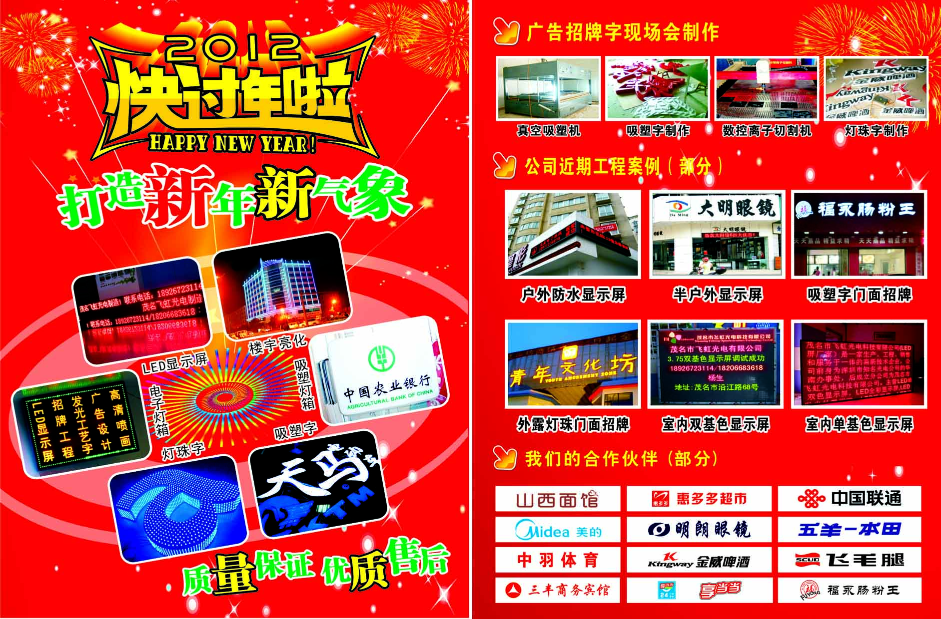 [attachmentid=287857]快过年啦,打制新年,新气象!我是茂名市飞虹光电的杨生,公司专业制作LED发光招牌,KTV亮化工程,LED电子显示屏制作、安装、维修,广告设计制作安装等!业务联系:18926713114/18206683618,地址:茂名市沿江路68号(沿江大酒店左侧)。如想知更多公司业务内容,可上百度搜索《茂名飞虹光电》打扰了!