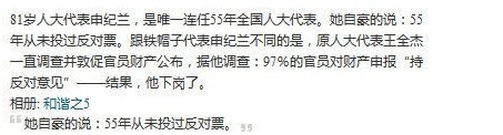 大跃进她赞成,人民公社她赞成,文革她赞成,斗刘少奇她赞成,斗邓小平她赞成,否定大跃进她赞成,否定人民公社她赞成,否定文革她赞成,平反刘少奇她赞成,平反邓小平她赞成。她活在世上就为了赞成。人大代表申纪兰,是唯一连任55年的全国人大代表,之所以能连任,就因为她赞成。
