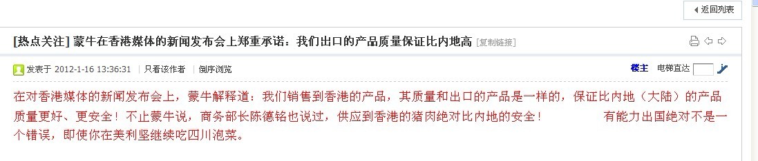A A仔 学前班 注册 2011-09-20 消息 62 反馈评分 0 点数 0 2012-01-16 #9 [attachmentid=289287] 在对香港媒体的新闻发布会上,蒙牛解释道:我们销售到香港的产品,其质量和出口的产品是一样的,保证比内地(大陆)的产品质量更好、更安全!不止蒙牛说,商务部长陈德铭也说过,供应到香港的猪肉绝对比内地的安全! 附件 1.jpg 71.8 KB · 查看: 297
