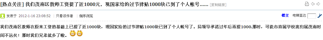 这是本人刚才闲逛茂名在线时看到的: 我们茂南区教师在原来工资的基础上已提了近1000块,现国家给的过节津贴1000块已到了个人帐号了。局领导承诺过年后再提1000.那时,可能市直属学校离归属茂南时间不远矣!那时我们兄弟就多了啦。 相关链接: https://idianbai.com/thread-2480981-1-1.html