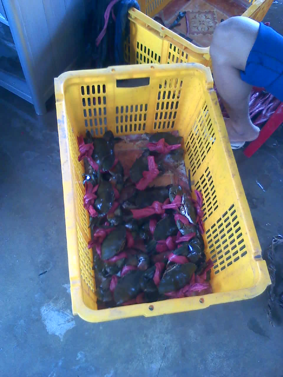 图中穿黑背心的是湛江吴川人,我朋友,挑蟹一等高手,蟹档的蟹在他手中会分出 肉蟹:A1,A2,A3。膏蟹:A1,A2,A3,元仔(没有经过交配的处女蟹)。还有水蟹(不要)和慢爪(快要挂掉的)。然后打包装船运到金瓯,陆运到西贡,空运到河内,陆运到东兴,东兴再到全国各地这样一个过程。基本上今天傍晚挑好的蟹,后天早上就抵达东兴海鲜市场。