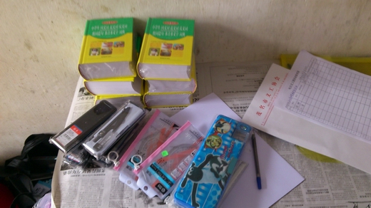 小丹捐赠书包10个、硬皮抄20本、铅笔1盒、圆珠笔5盒;