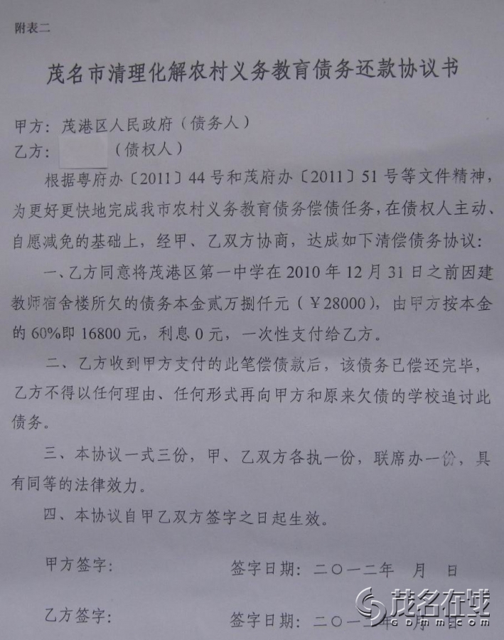 南方农村报记者采访发现,目前,茂名各县市区正在加紧清理化解农村义务教育债务,由于负担重、财政困难等原因,一些县市区在实际操作中“鼓励”债权人主动减免本息,如茂港区和化州市便分别“提倡”债权人捐赠债款本金的40%和50%“支持学校建设”,引来了不少债权人的质疑(3月31日《南方农村报》)。