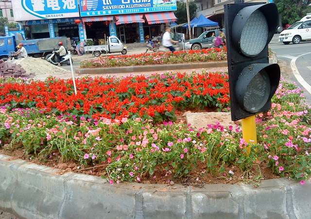 今天下着雨,经过三角墟红绿灯时,见到工人们在灯柱下忙碌种植鲜花,远近观看还挺显眼的,也引来众多途经此路段的行人不少目光,但不知这些花能否挺得住多久. [attachmentid=293482] [attachmentid=293483]