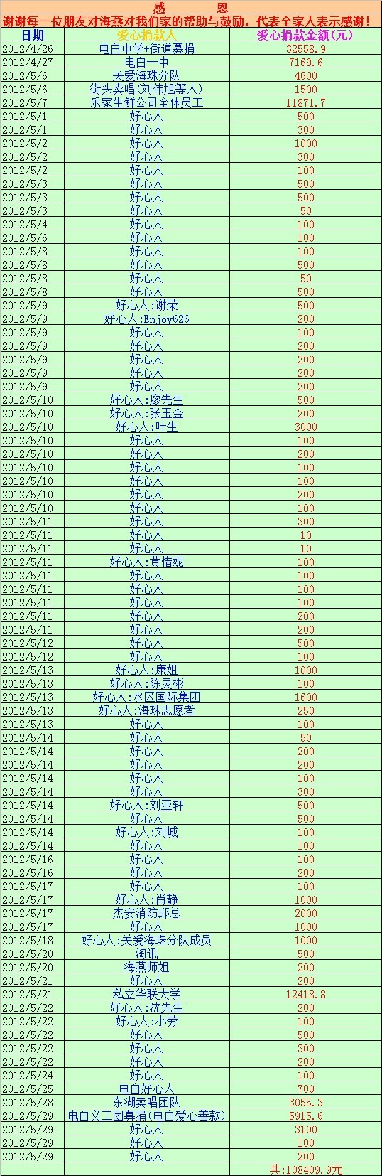 水 水东吴海波 小学二年级 注册 2012-05-04 消息 180 反馈评分 0 点数 0 2012-06-05 #163 社会爱心捐款明细如下,谢谢,感激,感恩... [attachmentid=295878] 附件 未命名.jpg 363.3 KB · 查看: 473