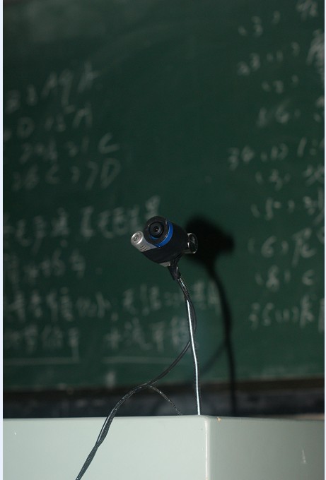 装好广角镜后效果确实好,只是韩国货也不怎样,彩色变成黑白了。然后就是在教室里安装了,安装也不容易,用网线改装了一条USB延长线。长线由于供电不足导致图像失帧,基本录下来的都是慢动作,不过也基本可以了吧,反正也主要是监视那些在课堂上捣蛋的人。但用起来的一两个星期,软件经常会出错,问题就是USB线太长了。最后干脆把延长线拔了,把摄像直接按在讲台上,然后捆绑在可以自由活动的麦克风头上。这样子,虽然不能监视全班,但可以任由科任老师使用,那部分人不听讲的就扭摄像头过去照着(这也后来才发现有趣的事情)。