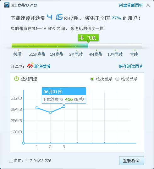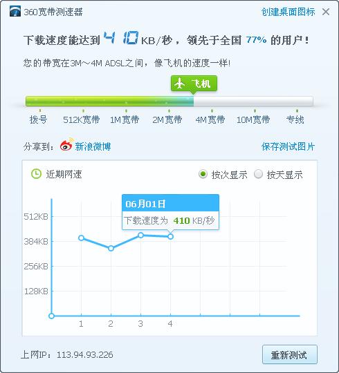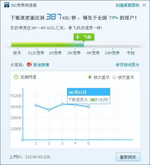 K kinon 学前班 注册 2006-06-16 消息 50 反馈评分 0 点数 0 2012-06-03 #15 参加电信光网城市后的网速,开WIFI 网络测速报告 测试过程中的平均网速:1.9MB/秒 当前网速属于专线速度 您的上网速度非常理想,可以快速完成各种互联网应用! 以上内容由金山卫士网络测速提供。 以前4M下载平均530K/S,峰值580K/S 家里人都用电信的号,家里4个电信手机加一部座机,打折后电话加宽带38元/月,还是很便宜的