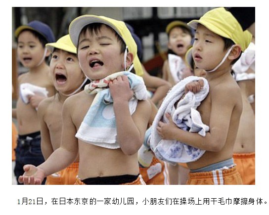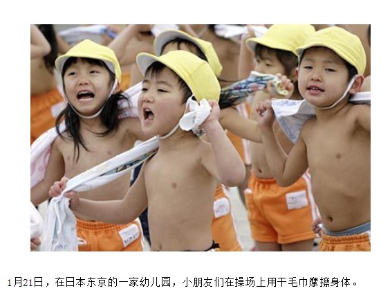 新华网2008年1月22报道,1月21日,在日本东京的一家幼儿园,小朋友们在操场上用干毛巾摩擦身体。这家幼儿园的400多名小朋友每天都会以这种方式在寒冬里锻炼身体,以增强抗寒能力。 (本文来源:新华网 )