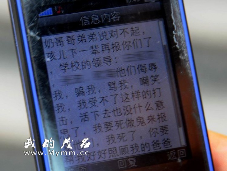 “姐,你要和爸爸妈妈奶奶哥哥弟弟说对不起,孩儿下一辈再报(答)你们了,学校的领导……侮辱我,骗我,骂我,嘲笑我,我受不了这样的打击,活下去也没什么意思了,我要死(后)做鬼来报复他们……”