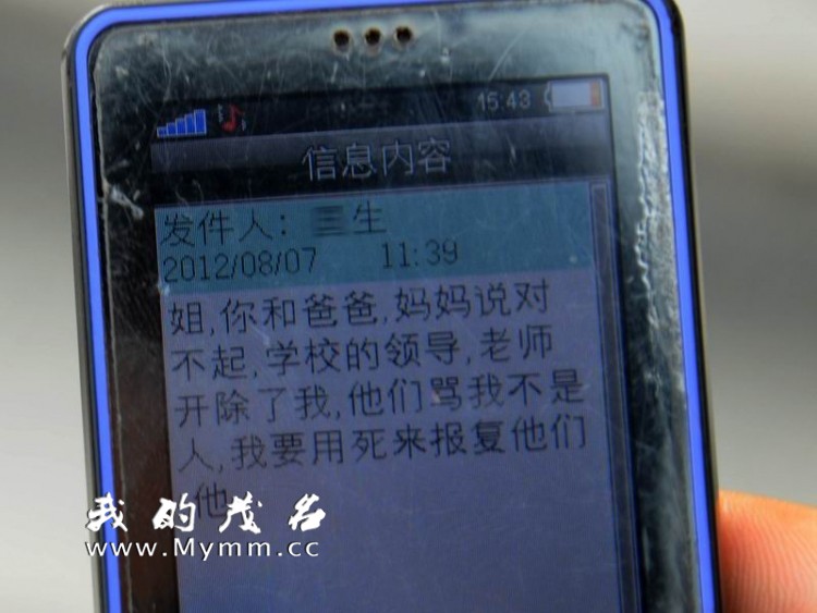 南都讯 记者 周松柏 昨日上午,茂名市电白县水东中学的一名高三学生从教学楼八楼坠下身亡。此前,他在给亲人发的短信中称,其遭到学校三名领导的辱骂、嘲笑,他要用自己的死来报复这些人。当地警方初步调查认为,这名学生系跳楼自杀。(来源:南方都市报 南都网)