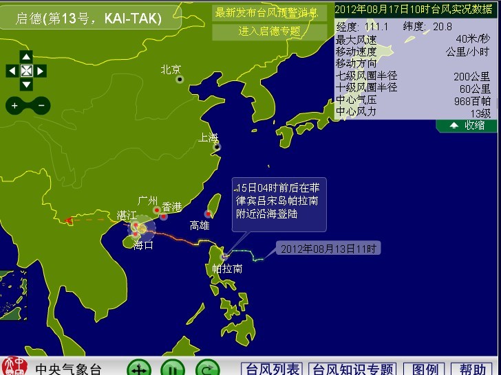 最新消息:今天上午 9 时,台风 “ 启德 ” 中心位于北纬 20 点 7 度,东经 111 点 2 度, 也就是在湛江市东南方约 100 公里 的海面上 ,中心附近最大风力 12 级,达到 35 米每秒的风速,中心最低气压 970 百帕,八级大风范围半径约 220 公里。