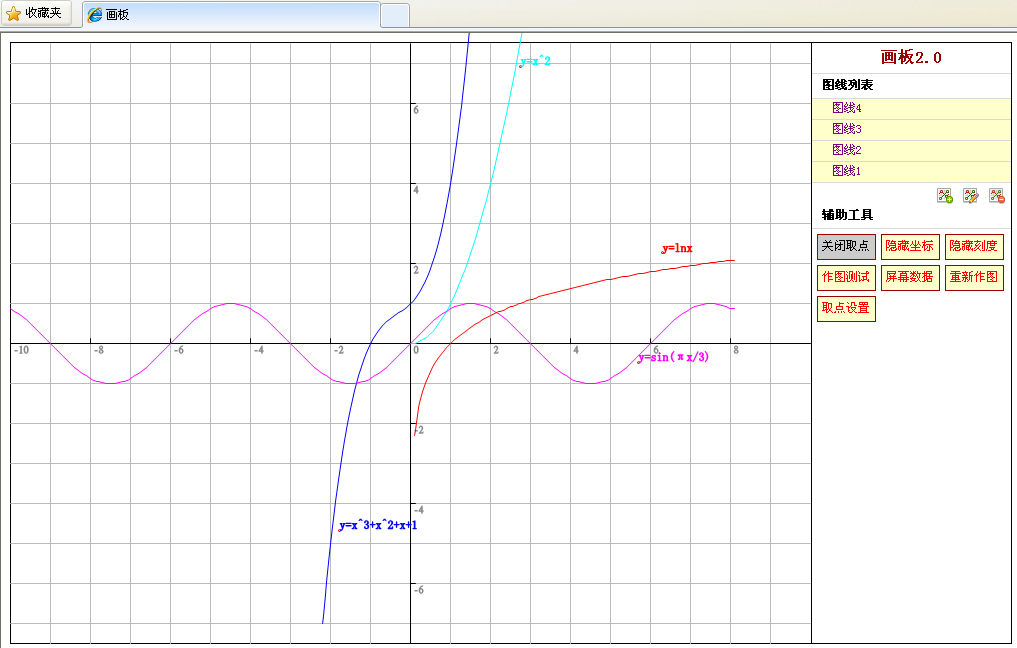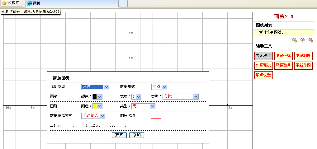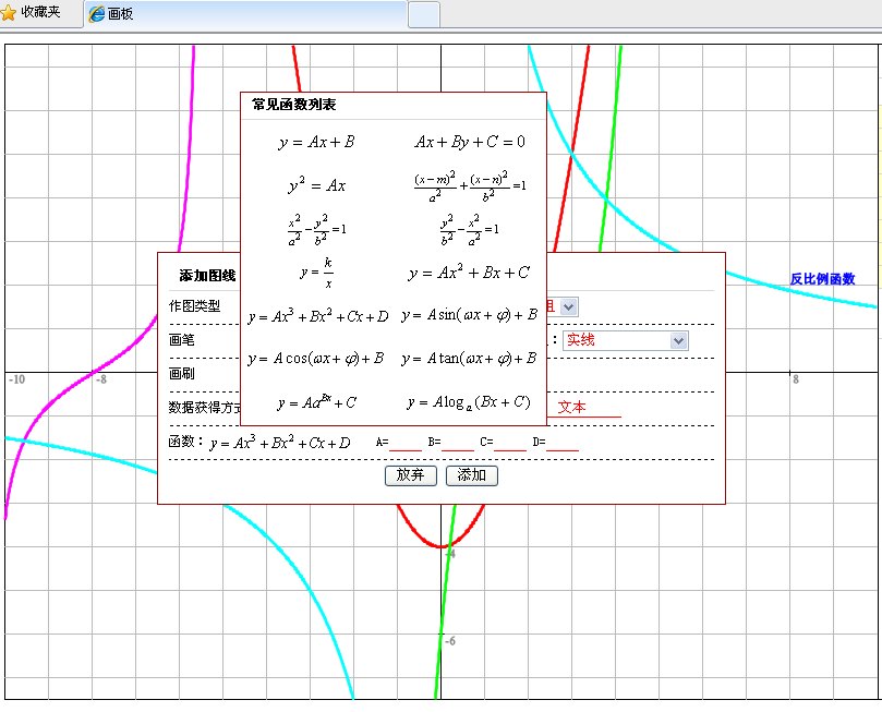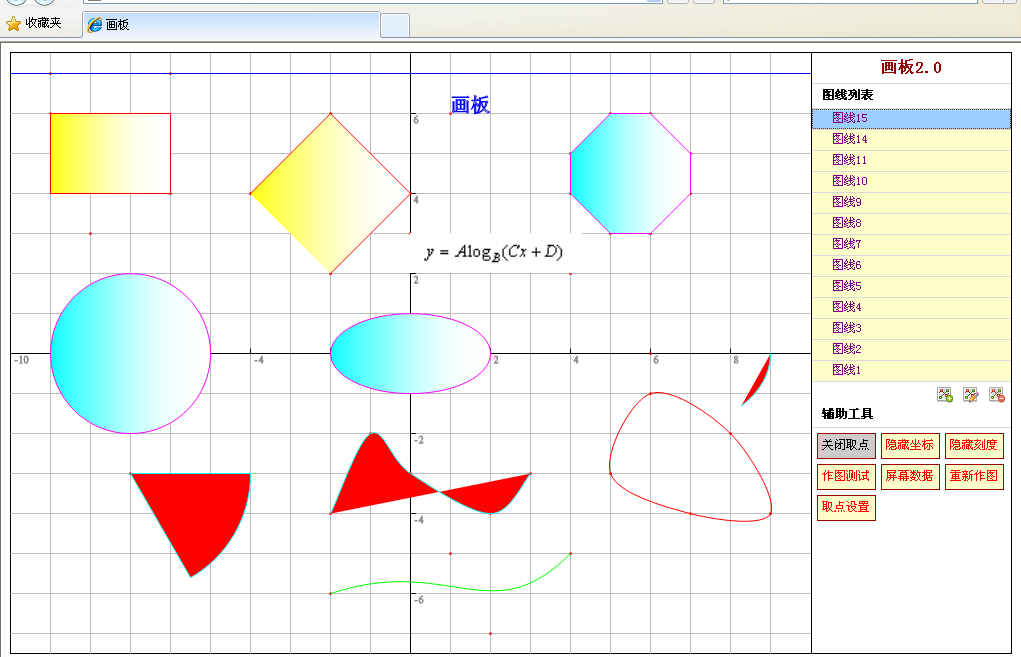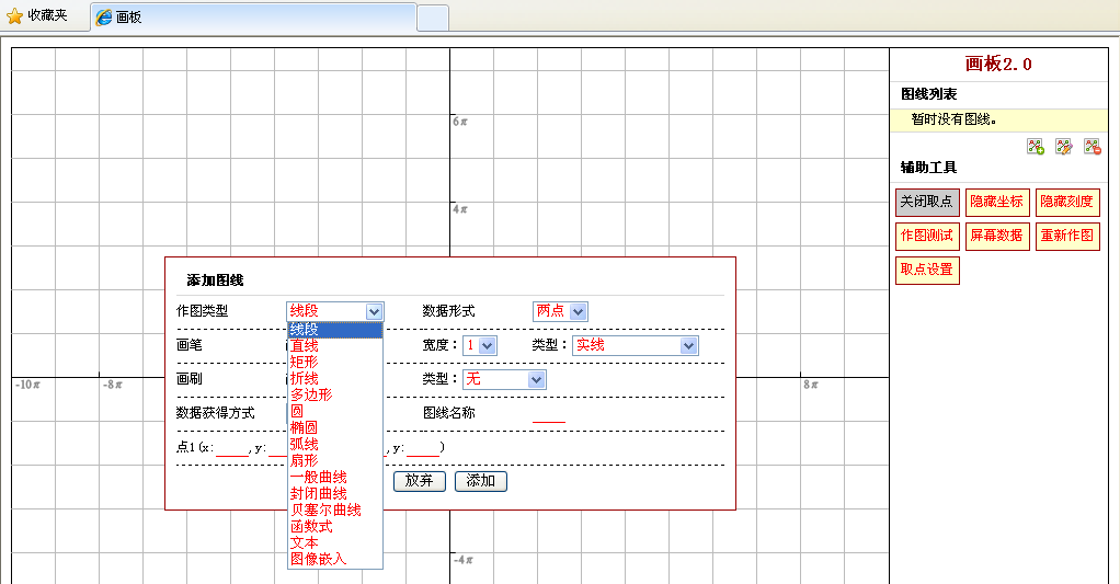 本软件用IE浏览器打开,有丰富的画图功能,并支持坐标设置、鼠标取点、函数式等。也支持贴图、文本。