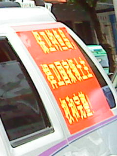在水东人民路见到一辆车身贴住:中华儿女团结起来,打倒小日本,保卫钓鱼岛,捍卫国家领土主权和完整的国产厢式面包车