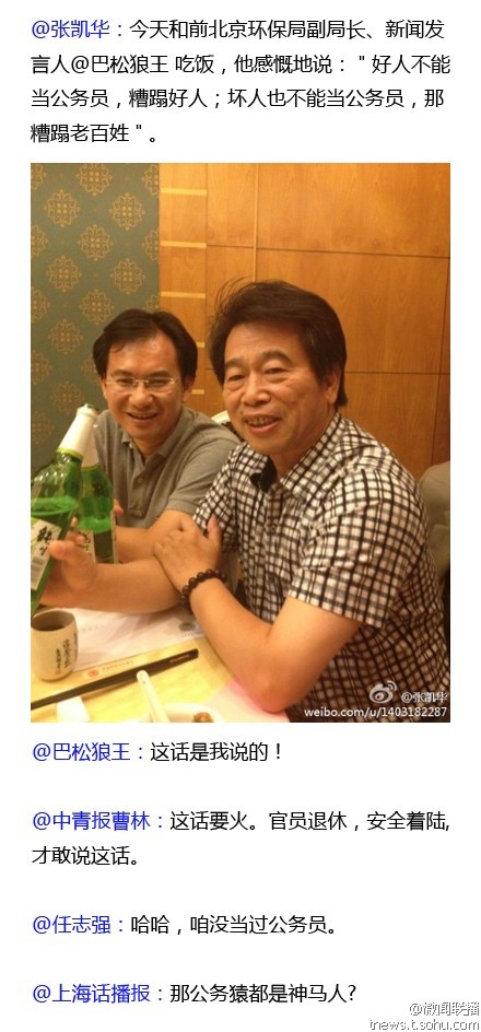 近日,前北京环保局副局长“巴松狼王”称:“好人不能当公务员,糟蹋好人;坏人也不能当公务员,那糟蹋老百姓”。其关于好人坏人与公务员的官场心得引发网友广泛关注。(源自网络)