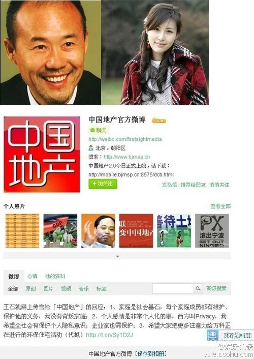 万科董事长王石游学美国已经一年多了,很多人奇怪,好端端的企业撒手不管,跑去美国念什么书啊?最近传来消息说,游学是假,新婚燕尔躲去美国享受二人世界是真。这下都明朗了,原来又是一个小三成功上位的故事。王石爱地产,更爱美人,为了美人连地产都可以不管了。 网上有知情人士爆料说,小三名叫田朴B,是个演员,曾经在《甄肿》里出演过角色。据说她是在长江商学院念书的时候认识的王石。早在2008年,她就已经公开表露了对王的爱意,如图所示: 不过,王石的前妻王江穗可不是简单的角色,王石能够有今天,和他老婆家人有莫大的关系。在媒体的镜头下,王石一直给人的印象是白手起家,艰苦奋斗,因为他知道有些话可以说给你听,有些却不能告诉你。 王石的父亲王辉是王震三五九旅的下属,王震后来率工程兵团到深圳开发特区,其父亦南下全家到了广州,后任柳州铁路局局长。王石的岳父叫王宁,曾经是王辉的战友。建国后历任广东省公安厅厅长,广东省政法委主任、省委常委,广东省副省长,ZG广东省委书记兼省纪委书记、省顾委主任。 王石在讲述自己赚第一桶金的时候,经常会提到他在深圳贩卖玉米的事儿,但其中有个细节很耐人寻味。王石发现中国北方的玉米要运到南方,都要从香港转运,这价格就上去了,如果直接可以从北方运到深圳,可以赚取不少差价。于是王石跑去广东海运局让他们开辟北方航线。但王手里没钱,他就让对方先发货,自己半年之后再结清。如果他只是个一穷二白的小屁孩,谁会理他呢?但他是省委书记的女婿啊,这一切都不同了。1983年4月到12月短短8个月,王石赚了300多万元。“这就是我下海挖的第一桶金,干干净净。”王石提起此事颇为自豪。这件事情告诉我们一个最朴素的真理:没有人能够随随便便成功。 此后王石做生意顺风顺水,他说他不会为了生意的事情去贿赂官员,这是显而易见的,因为他的靠山比谁都大,官员反过来巴结他才是正确的嘛。有个叫刘元生的商人很聪明,在万科成立之初就投了400万,此后这些钱升值了数百倍。记者问他为什么会投资万科,他说王石这个人和别人不同,一到香港就买书看,所以他想也没想就投了钱。不过也有人说真正的原因是,他看中了王的家庭背景,他这400万不仅是看好王石,更有可能是看好他背后的庞大关系网。 来源:天涯八卦版 八卦比许多正儿八经的版块可爱,呵呵。