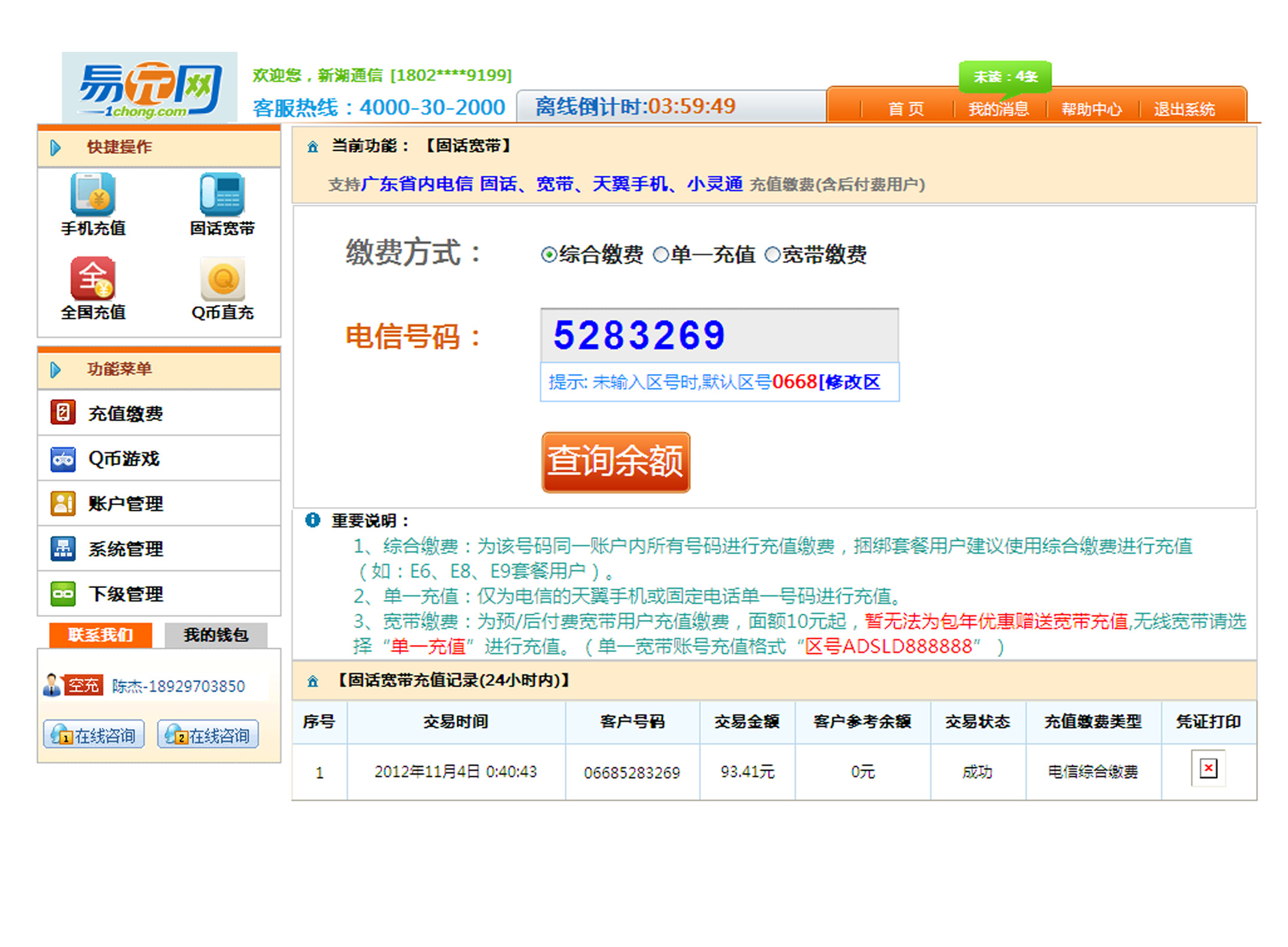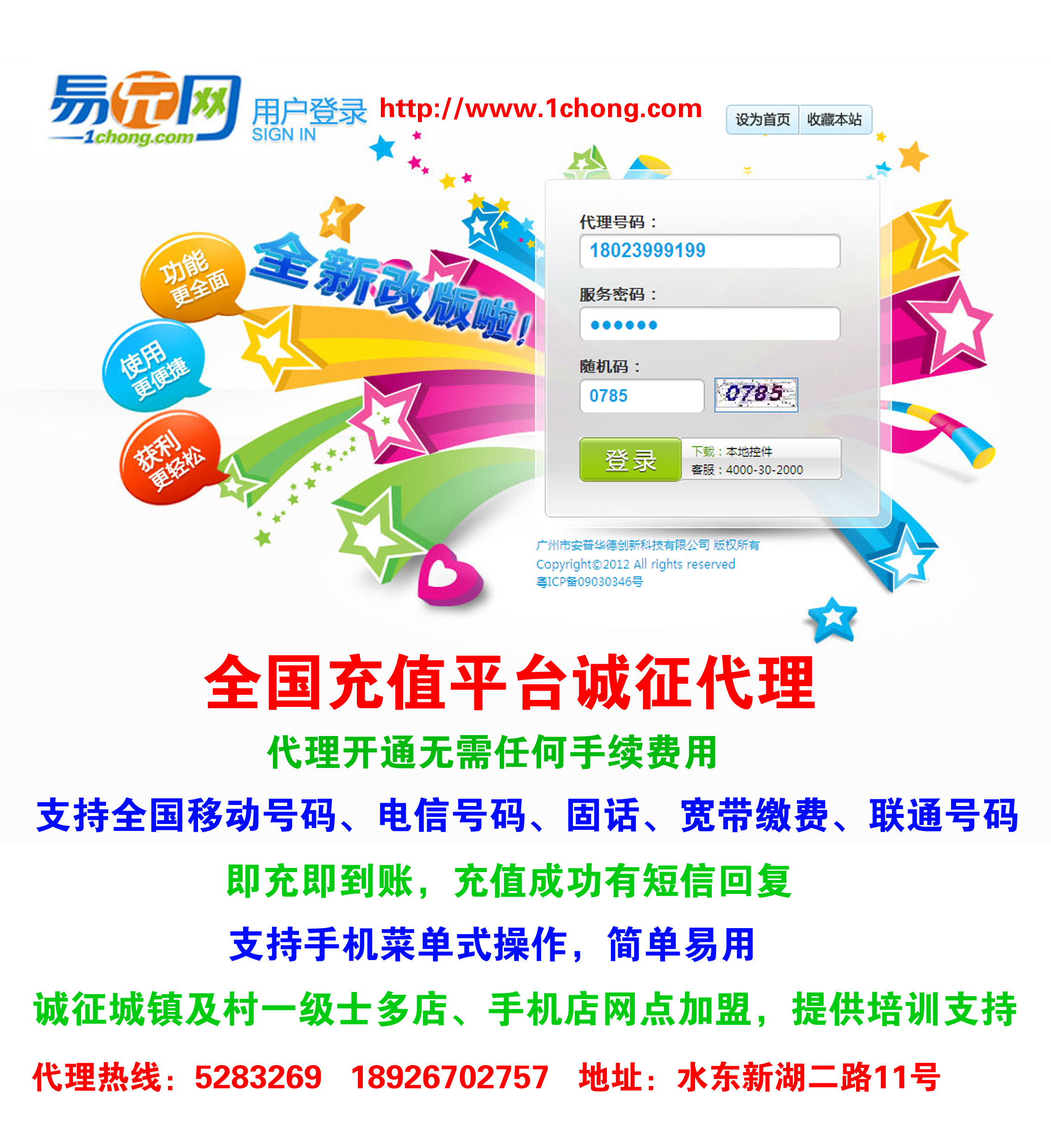 开通此充值平台,可解决村一级民众到镇内网点缴交固定电话费用的问题!同时提供移动、联通及电信手机号码的充值服务,即充即到账。 易充网http://www.1chong.com [attachmentid=302414] [attachmentid=302415]