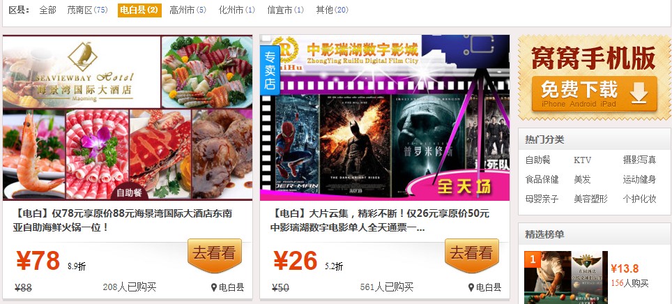 窝窝网(茂名第一个生活服务消费团购网站)的电白团购项目