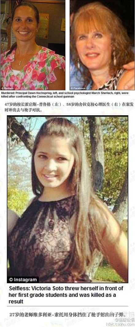 英国每日邮报报道,在美国康州小学枪击案中,有3位女老师展现出了人性光辉。27岁的维多利亚-索托用身体挡住枪手射出的子弹,拯救了学生。47岁校长霍启斯-普鲁格、58岁心理医生舍拉克校冲出去与枪手对抗,双双献出了生命。@微天下