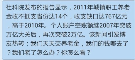 这份由中国社科院发布的报告显示,2011年城镇职工养老金收不抵支省份达14个,收支缺口达767亿元,高于2010年。