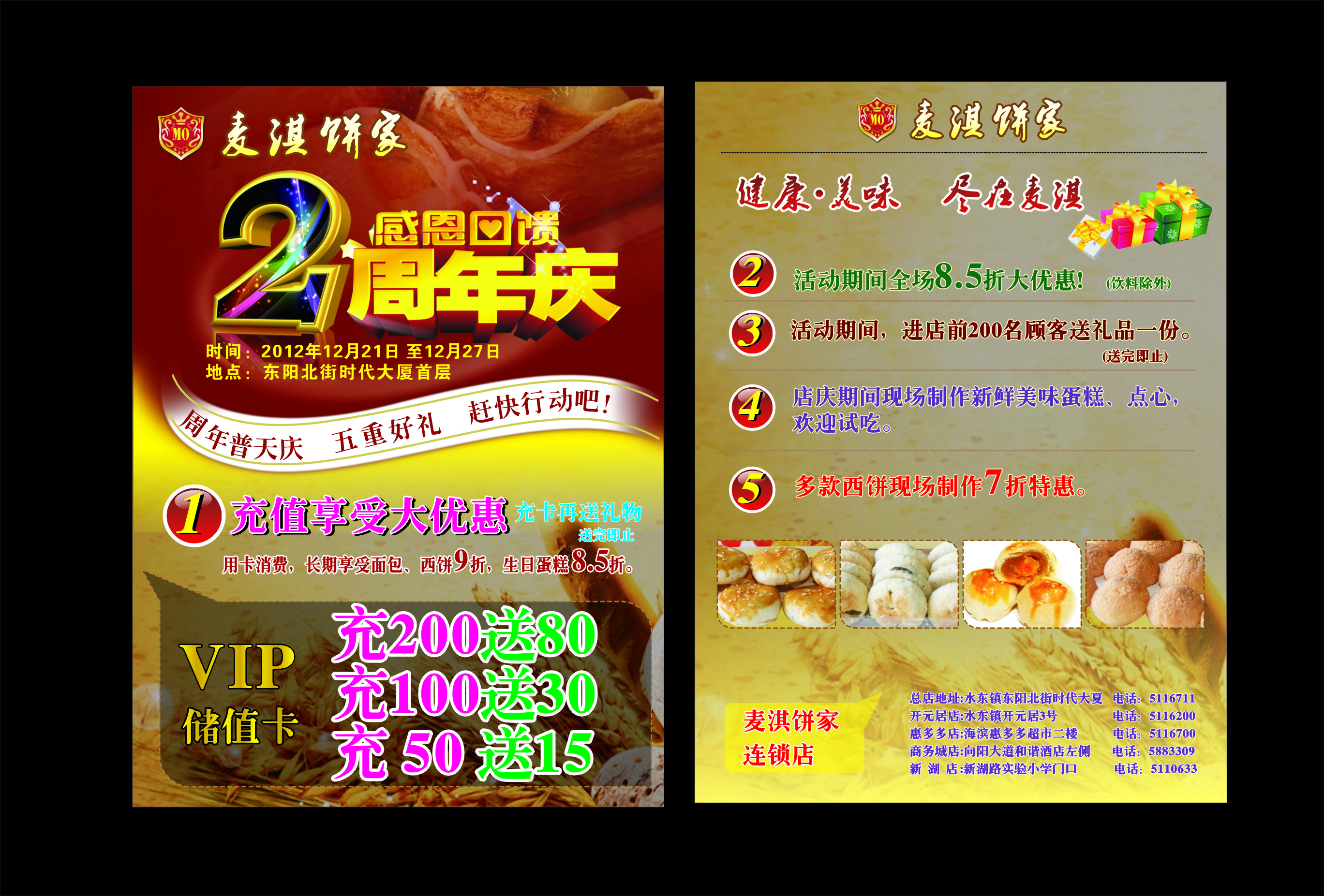 yinsha 学前班 注册 2005-09-22 消息 87 反馈评分 0 点数 0 年龄 47 2012-12-20 #1 广而告之 水东麦淇饼家2周年店庆 总店地址 : 水东镇东阳北街时代大厦总店 电话: 5116711 开元居店 : 水东镇开元居3号 电话:5116200 惠多多店 : 海滨惠多多超市二楼 电话: 5116700 商务城店 : 向阳大道和谐酒店左侧 电话: 5883309 新湖店 : 新湖实验小学门口 电话: 5110633 附件 麦淇饼家2周年店庆宣传单.jpg 2.4 MB · 查看: 556