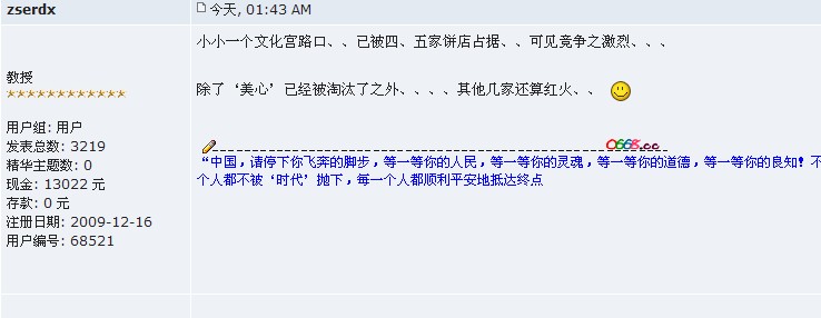 Z zserdx 荣誉主席 注册 2009-12-16 消息 7,649 反馈评分 76 点数 71 2012-12-20 #7 小小一个文化宫路口、、已被四、五家饼店占据、、可见竞争之激烈、、、 除了‘美心’已经被淘汰了之外、、、、其他几家还算红火、、