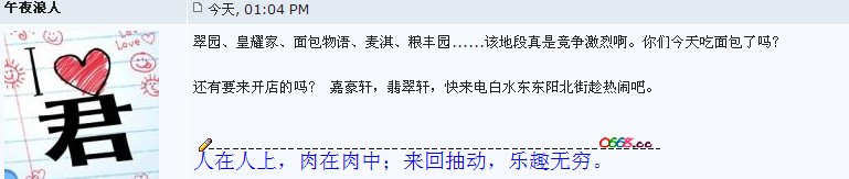 午夜浪人 小学五年级 注册 2012-09-02 消息 331 反馈评分 0 点数 1 2012-12-20 #12 翠园、皇耀家、面包物语、麦淇、粮丰园......该地段真是竞争激烈啊。你们今天吃面包了吗? 还有要来开店的吗? 嘉豪轩,翡翠轩,快来电白水东东阳北街趁热闹吧。