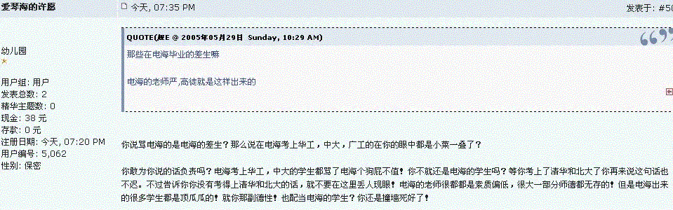 爱 爱琴海的许愿 幼儿园 注册 2005-05-29 消息 28 反馈评分 0 点数 0 2005-05-29 #5 NO.4的回复是回复NO.3的,那太小了看不见! 你说骂电海的是电海的差生?那么说在电海考上华工,中大,广工的在你的眼中都是小菜一叠了? 你敢为你说的话负责吗?电海考上华工,中大的学生都骂了电海个狗屁不值!你不就还是电海的学生吗?等你考上了清华和北大了你再来说这句话也不迟。不过告诉你你没有考得上清华和北大的话,就不要在这里丢人现眼!电海的老师很都都是素质偏低,很大一部分师德都无存的!但是电海出来的很多学生都是顶瓜瓜的!就你那副德性!也配当电海的学生?你还是撞墙死好了!