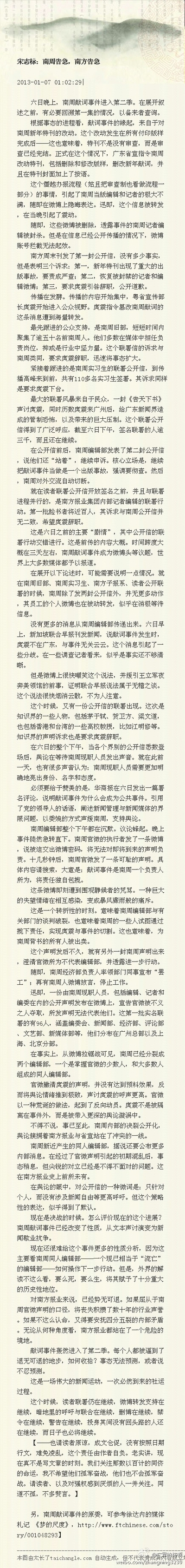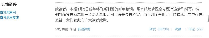 编者按:2013年《南方周末》的第一期按照惯例将刊发新年献词,但今年献词不仅被广东省委宣传部勒令反覆修改。据南周的媒体人爆料去年空降广东的前新华社副社长亲自动手,把献词改得面目全非,成为一篇歌功颂德,肉麻不堪的文章。在有关编辑拒绝签版,违反编辑流程,亲自签发将错误频出的文字强加到报纸头版,引起媒体人极大愤怒。媒体人称现在的新年献词为“强奸版”,并把原来新年献词发到网络上。
