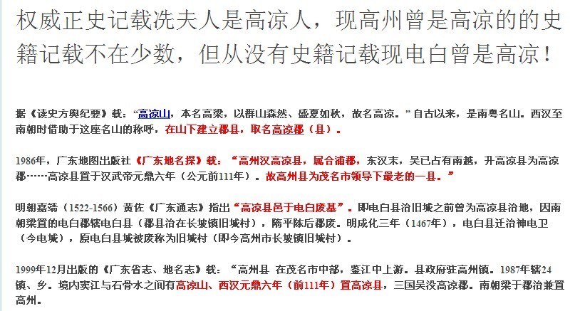 权威正史记载冼夫人是高凉人,现高州曾是高凉的的史籍记载不在少数,但从没有史籍记载现电白曾是高凉!