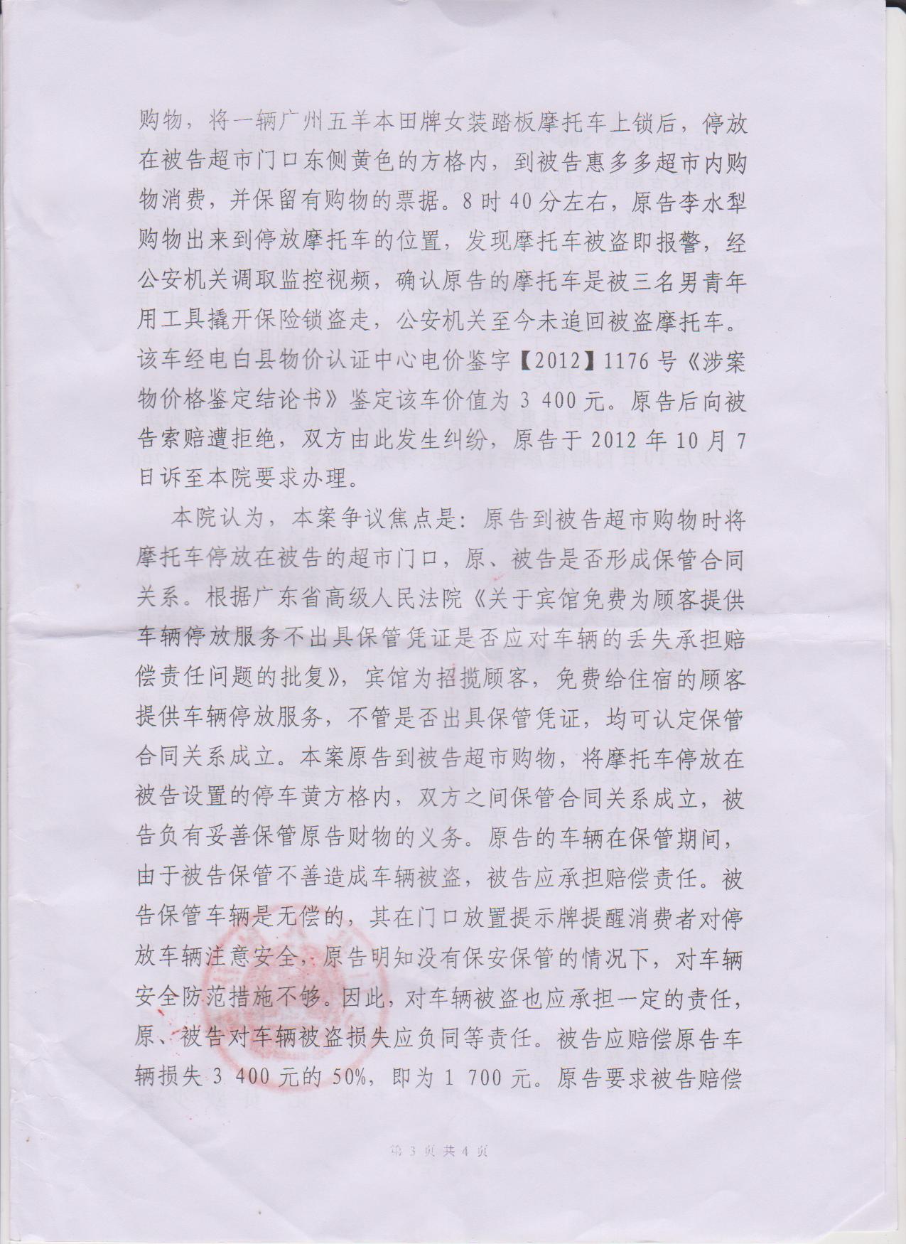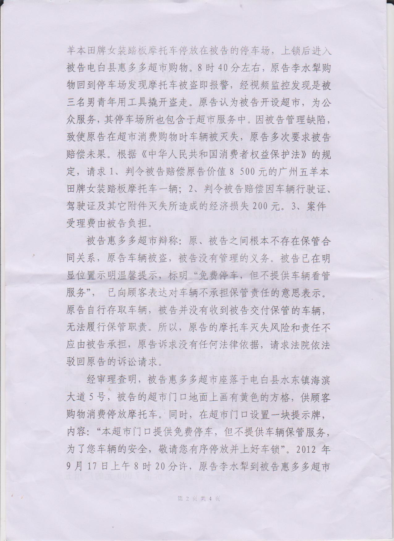 前闻回顾:2012年11月5日上午听电白法庭的朋友说,水东东湖那个“惠多多”超市被一客人人告上电白法庭,听说是客人的摩托车放在“惠多多”门口停车场被盗了,这客人就将“惠多多”告上法庭要求“惠多多”赔偿,我又听说开庭时“惠多多”的代理律师辩解称,“惠多多”在停车场已经贴上了“提示”,意思是说停车场是免费提供,被盗与商场无关的意思。后来法庭要求双方调解,听说“惠多多”不愿意。如果这官司,被盗摩托车的客人能打赢官司,将是电白首例。这样来大家都商场买东西不见车了,就多一个途径追回损失了,不用单靠那些无用的电白公安啦。我支持客人打打赢官司,你们支持谁?如果有结果,我会第一时间公布。经常在“惠多多”买到将近过期的饮料,吐血。