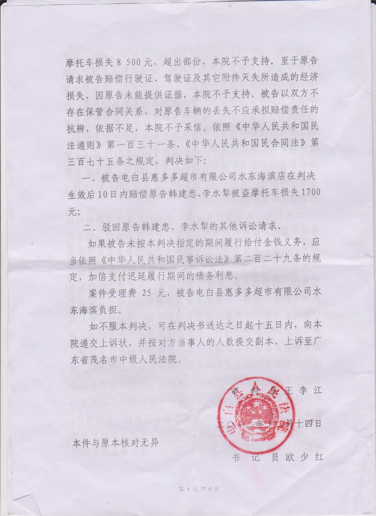 判决书:水东海滨“惠多多”超市,客人被盗摩托车维权成功