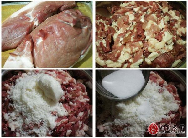主料:9斤瘦肉、1斤肥肉切1公分左右的肉丁,调味料一袋。