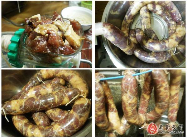 将以上材料与肉搅拌一起煨1小时,灌入肠衣内,凉2-3天后蒸15分钟即可食用。