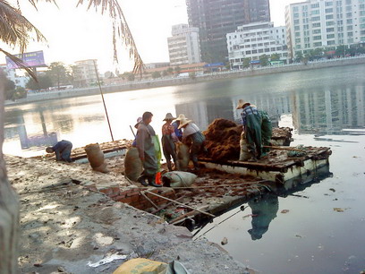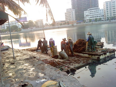 青苔是污染所致, 江篱是藻类,可以食用。 是医用的琼脂的原料,我们吃的东洋菜也是它制作。 不是用来养虾用,是放在虾塘里和虾混养。 西湖7、80十年代曾经投苗,没有成功。90年代却意外生长出。 90年代一段时间,江篱年产值不菲。
