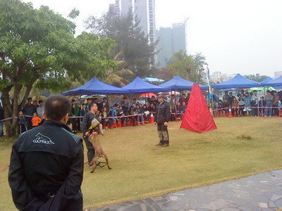 1月26日上午,来自水东地区,茂名市区,湛江地区,阳江地区,高州地区,信宜..等地区,在水东东湖舞池广场,迎来首届爱犬展,当日间中下着微雨,但各地区宠犬爱好者的参与热情丝豪未减,各自领着自己的爱犬参与角逐各项比赛,展现爱犬强劲艳丽一面!而下午即主持人所讲的,将由邀请嘉宾香港特犬训练院教官陈S与其助手们现场表演特犬追逐模拟疑犯场面与特犬爱犬营救主人解除危难险..等景象!(观场众切莫模仿)祝此展以后越办越好越精彩!