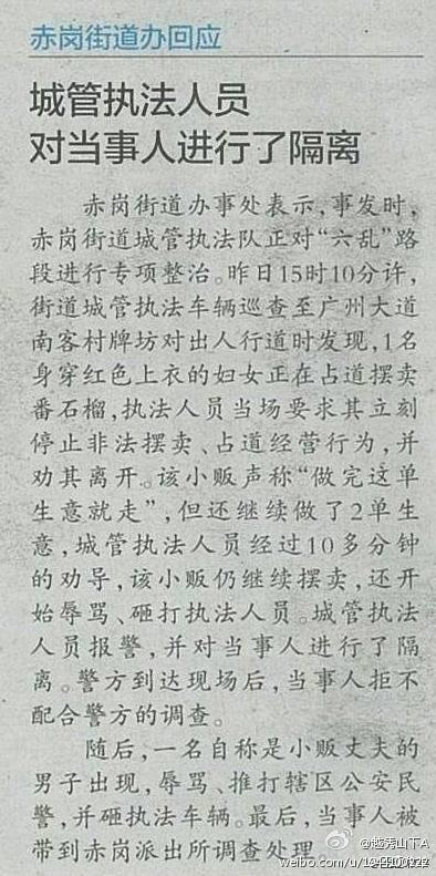 三 三角仔 小学四年级 注册 2009-11-02 消息 257 反馈评分 1 点数 1 2013-03-07 #15 “我今天就不走!”“你听我说,配合下工作,收拾收拾走了!”“你信不信,要不是你今天带着孩子,我绝对打你!”最终劝说无效,她终究被掐着脖子打了。昨日下午三点半,广州大道南近客村立交处,城管人员执法过程与一女摊贩发生口角,后因忍受不住怒气动手,随后警方,女摊贩老公到场,又发生纠纷。