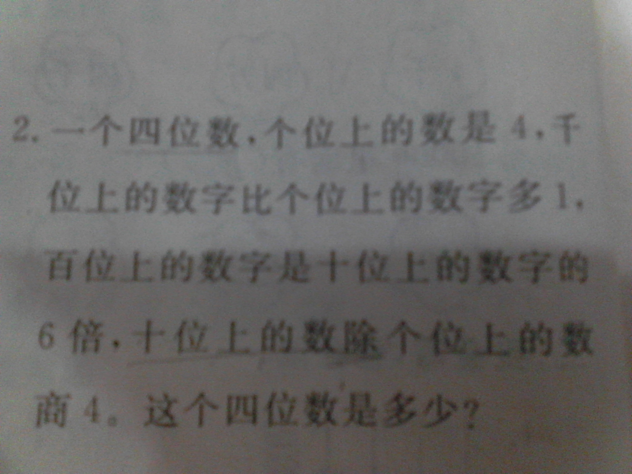 绿 绿城百姓 博士后 注册 2009-03-02 消息 1,520 反馈评分 29 点数 71 2013-03-29 #7 关键是这句话:“十位上的数除个位上的数商4”,也就是个位上的数除以十位上的数,即4除以(十位上的数)商4,可知十位上的数就是1,那么百位上的数是十位上的数的6倍,显然就是6,所以这个四位数是5614.