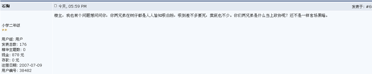 楼主,我也有个问题想问问你,你两兄弟在树仔都是人人皆知吸白粉,吸到差不多要死,案底也不少。你们两兄弟是什么当上政协呢?还不是一样官场黑暗。
