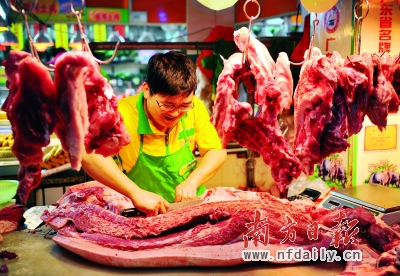当几十斤的边猪被扛上案板,屠刀已在鲜嫩的肉上横飞直闯,依附在瘦肉上的碎油被迅速切掉,然后挥霍着大刀把边猪砍成两半,再顺着排骨将肉与其分离,短短几分钟就将边肉按不同部位分解成肉头、猪手脚、排骨、瘦肉、花肉等,同时嘴里还不停地叫喊着“大公司、大品牌,上过中央电视台”等口号吸引顾客。