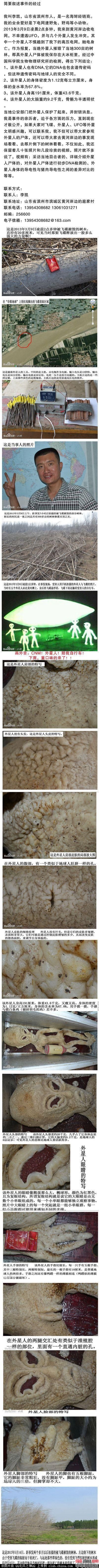 李某曾经在Q群219522503呆过,对神秘事件有些了解。 三个月前在黄河边上用电网电兔子时,碰到五个乘着飞碟的外星人,电死一个后,被他收藏在自家的仓库内。该尸体1.9米长,45公斤,头很大,有照片有视频。李某还称,期间有两组专家专程来他家研究过外星人,“他们说这个生物的DNA与地球人的不一样”。