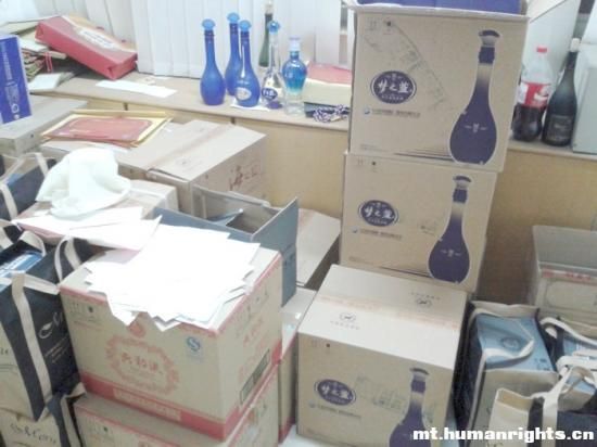 根据爆料者提供的材料显示,在靖江市工商局内部餐厅的仓库里(518室),堆放着整箱整箱的高档名酒,其中有茅台、五粮液、梦之蓝等等。有些已经拆箱,有些还未拆封,其中在靠墙的柜子上还放着几个喝剩的空酒瓶。