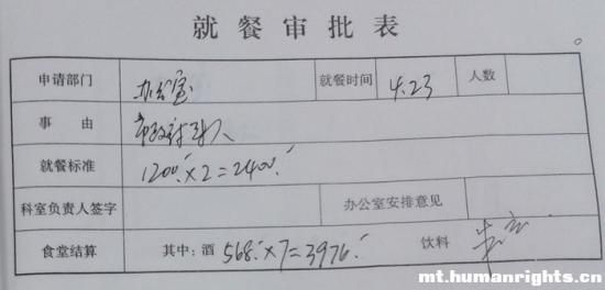 爆料人提供的照片中,不仅有堆成小山的名烟名酒,还有数张“靖江工商局接待物品领用单”,单子上的日期从今年4月23日到6月9日,其“领用部门”一栏中,有来自“公交科”、“办公室”、“局长室”、“人教科”等多个部门,其中还有一个为“放心办”,其领用事由则各有不同。“餐厅是内部食堂,但装修豪华,可与五星级酒店媲美,几乎天天有酒席,顿顿是豪餐。并且,局长朱建忠也几乎餐餐出席,杯杯豪饮。”
