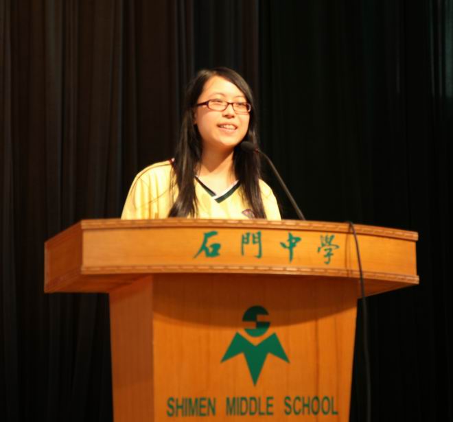 石门中学校长盘文健老师在大会上表示,“十大优秀学生”等评选活动是我校实施“精致德育”教育方针的一项重要内容,希望同学们在石中这个优秀的大家庭,能够掀起学优秀、做优秀的新浪潮;希望有更多同学从平时做起、从小事做起、从自己做起,争当来年的优秀学生。盘校长在发言中激动地向在座的老师、同学们和家长们宣读今年石中的高考喜报。他提到,石中今年的高考成绩有“三牛”――最“牛”的重本人数(786人)、最“牛”的尖子生(李滢同学和王苏同学分获市文理科榜眼、已有近10位学生将被北大、清华、香港大学等著名高校录取)、最“牛”的班主任(外教Neil老师,他所任教的班级重点率100%,6人进入全省文科前100名)。盘校的讲话使得同学们大受鼓舞,纷纷报以热烈的掌声。