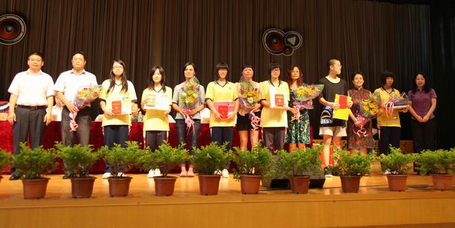 项书记随后宣布获奖名单,德育处副主任袁晓明老师主持颁奖仪式。高一15班黄惠璇、高二16班罗慧盈、高三8班王苏同学荣获“佛山市优秀学生”称号;高三20班张雯婷荣获“佛山市优秀学生干部”称号;高二5班罗榕蓉、梁婉雯分别被评为“佛山市优秀团干”和“佛山市优秀团员”;获得石门中学2012-2013学年度 “十大优秀学生”荣誉称号的同学是:高一6班孙启蒙、高一6班孔子欣、高一16班黎芷莹、高一16班朱绮雯、高二4班蔡泽延 、高二5班陈劲、高二8班温颂恒、高二10班徐佩璇、高二16班罗慧盈、高三8班施展同学,石门中学校长盘文健老师、党委书记项玲老师为这些同学以及家长颁奖。此外,大会还表彰并给获得“南海区优秀学生”、“南海区优秀学生干部”、“南海区优秀团员”、石门中学“十大优秀学生干部”、“十大文明礼仪学生”颁奖。