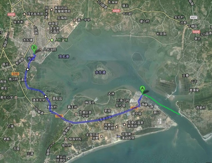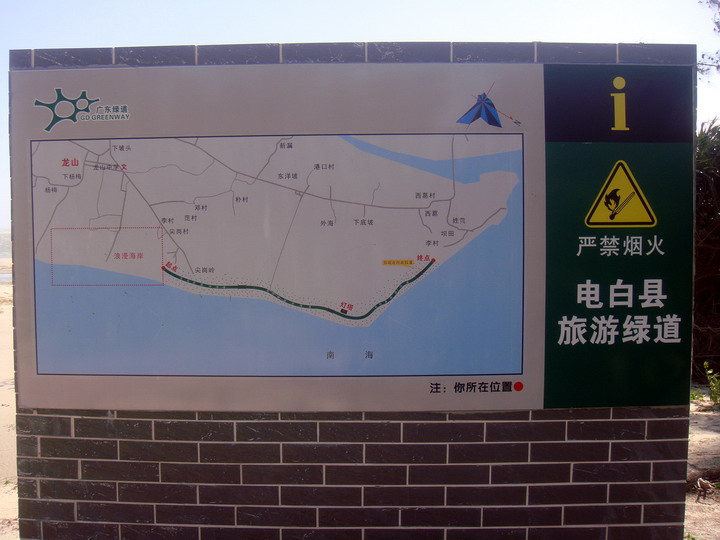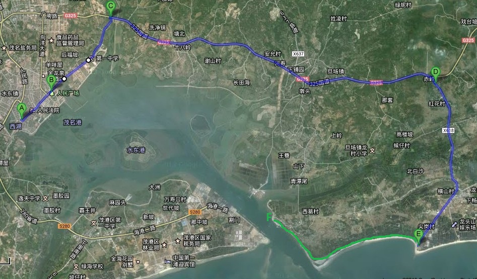 去程。绿色线为电白旅游绿道,F为西葛渔排