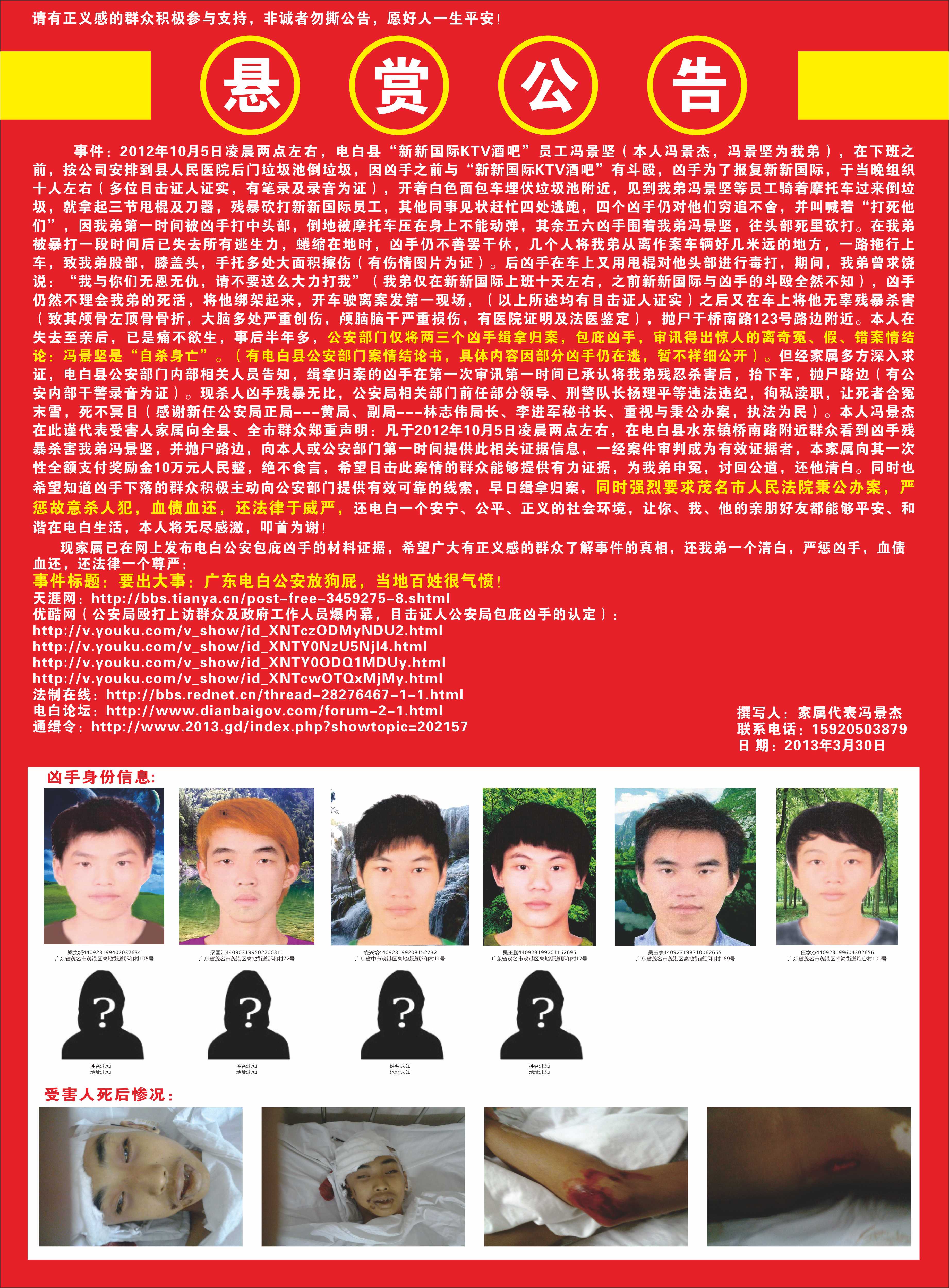 事件:2012年10月5日凌晨两点左右,电白县“新新国际KTV酒吧”员工冯景坚(本人冯景杰,冯景坚为我弟),在下班之前,按公司安排到县人民医院后门垃圾池倒垃圾,因凶手之前与“新新国际KTV酒吧”有斗殴,凶手为了报复新新国际,于当晚组织十人左右(多位目击证人证实,有笔录及录音为证),开着白色面包车埋伏垃圾池附近,见到我弟冯景坚等员工骑着摩托车过来倒垃圾,就拿起三节甩棍及刀器,残暴砍打新新国际员工,其他同事见状赶忙四处逃跑,四个凶手仍对他们穷追不舍,并叫喊着“打死他们”,因我弟第一时间被凶手打中头部,倒地被摩托车压在身上不能动弹,其余五六凶手围着我弟冯景坚,往头部死里砍打。在我弟被暴打一段时间后已失去所有逃生力,蜷缩在地时,凶手仍不善罢干休,几个人将我弟从离作案车辆好几米远的地方,一路拖行上车,致我弟股部,膝盖头,手托多处大面积擦伤(有伤情图片为证)。后凶手在车上又用甩棍对他头部进行毒打,期间,我弟曾求饶说:“我与你们无恩无仇,请不要这么大力打我”(我弟仅在新新国际上班十天左右,之前新新国际与凶手的斗殴全然不知),凶手仍然不理会我弟的死活,将他绑架起来,开车驶离案发第一现场,(以上所述均有目击证人证实)之后又在车上将他无辜残暴杀害(致其颅骨左顶骨骨折,大脑多处严重创伤,颅脑脑干严重损伤,有医院证明及法医鉴定),抛尸于桥南路123号路边附近。本人在失去至亲后,已是痛不欲生,事后半年多,公安部门仅将两三个凶手缉拿归案,包庇凶手,审讯得出惊人的离奇冤、假、错案情结论:冯景坚是“类自杀身亡”。(有电白县公安部门案情结论书,具体内容因部分凶手仍在逃,暂不祥细公开)。但经家属多方深入求证,电白县公安部门内部相关人员告知,缉拿归案的凶手在第一次审讯第一时间已承认将我弟残忍杀害后,抬下车,抛尸路边(有公安内部干警录音为证)。现杀人凶手残暴无比,公安局相关部门前任部分领导、刑警队长杨理平等违法违纪,徇私渎职,让死者含冤末雪,死不冥目(感谢新任公安局正局---黄局、副局---林志伟局长、李进军秘书长、重视与秉公办案,执法为民)。本人冯景杰在此谨代表受害人家属向全县、全市群众郑重声明:凡于2012年10月5日凌晨两点左右,在电白县水东镇桥南路附近群众看到凶手残暴杀害我弟冯景坚,并抛尸路边,向本人或公安部门第一时间提供此相关证据信息,一经案件审判成为有效证据者,本家属向其一次性全额支付奖励金10万元人民整,绝不食言,希望目击此案情的群众能够提供有力证据,为我弟申冤,讨回公道,还他清白。同时也希望知道凶手下落的群众积极主动向公安部门提供有效可靠的线索,早日缉拿归案,同时强烈要求茂名市人民法院秉公办案,严惩故意杀人犯,血债血还,还法律于威严,还电白一个安宁、公平、正义的社会环境,让你、我、他的亲朋好友都能够平安、和谐在电白生活,本人将无尽感激,叩首为谢!